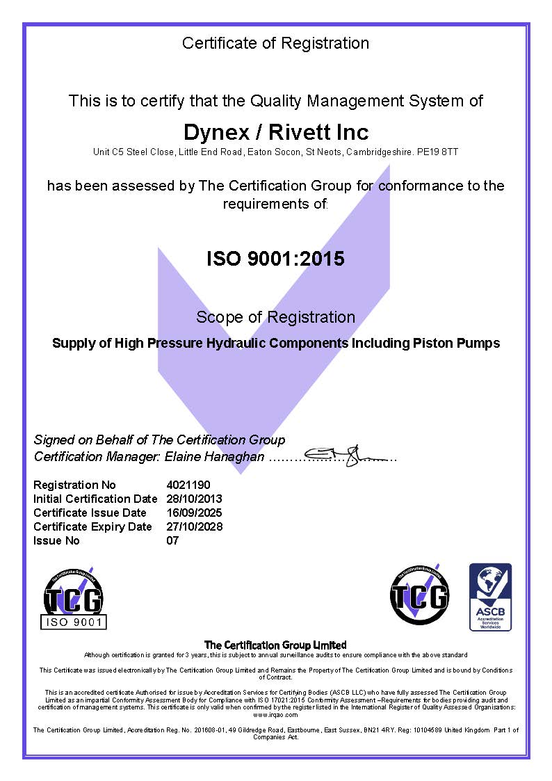 Dynex Pewaukee has undergone assessment by Verisys Registrars and has been certified as meeting the requirements of ISO 9001:2015.